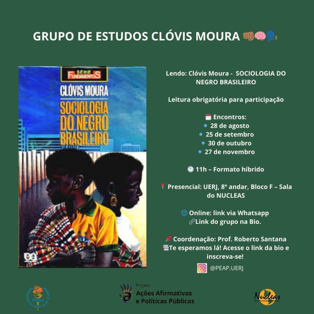Neste semestre, o grupo se dedica à leitura da obra “Sociologia do Negro Brasileiro”, de Clóvis Moura. A leitura do livro é obrigatória para quem deseja participar dos encontros.
